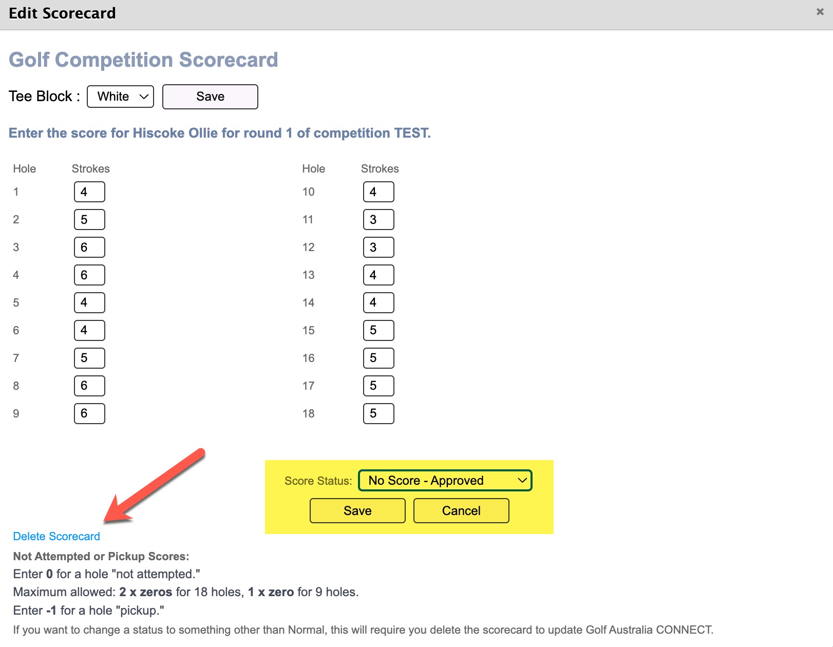 To apply a status of No Score Approved, you need to delete the scorecard and then click save.